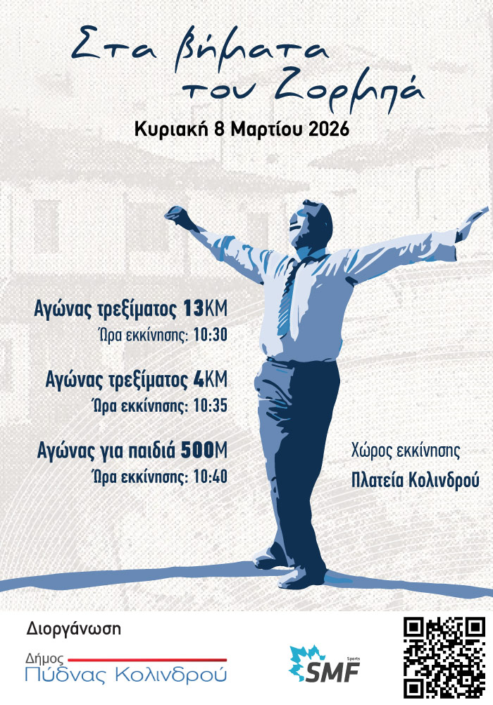 Ο Δήμος Πύδνας Κολινδρού διοργανώνει για δε΄υτερη χρονιά τη διοργάνωση «Στα βήματα του Ζορμπά» στο δημοτικό διαμέρισμα του Κολινδρού Πιερίας. H εκδήλωση περιέχει αγώνες τρεξίματος 13ΚΜ και 4ΚΜ καθώς και παιδικό αγώνα 500 μέτρων.